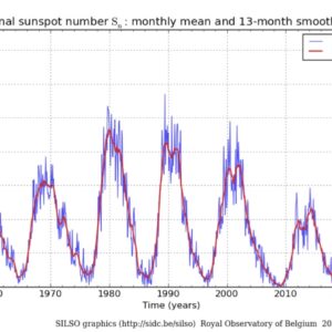 Diagrammet är hämtat från SILSO. Blått indikerar månadsvärden och rött 13-månaders-värden.