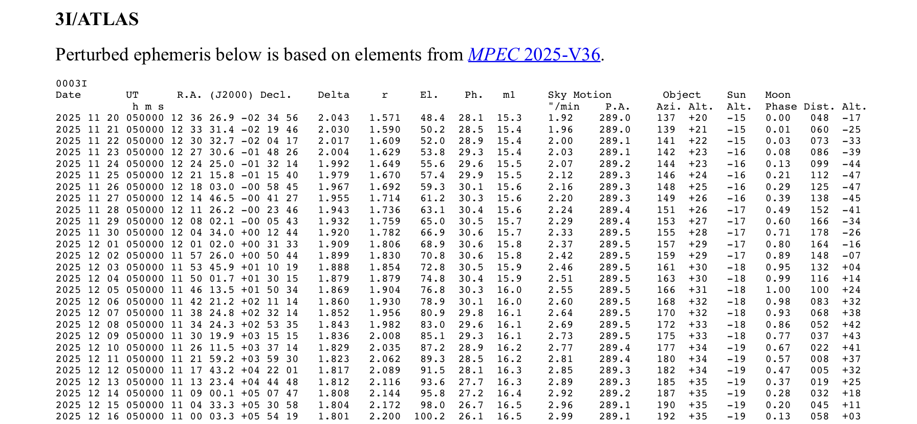 3I/ATLAS är nu av magnitud 10. Efemeriden visar dess position klockan 05 UTC (06 SNT). Som plats har valts longitud 15 grader ost, latitud 60 grader nord.