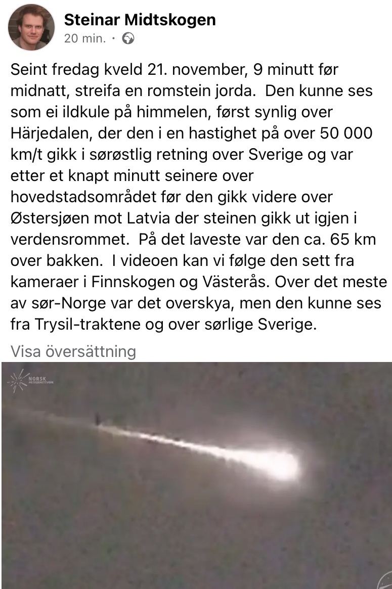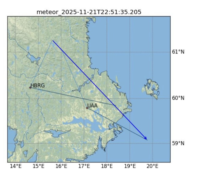 Den norska analysen av meteoroidens synliga bana, baserad på två stationer, ges nedan. Ett annat klipp visar den svenska analysen, baserad på två andra stationer.