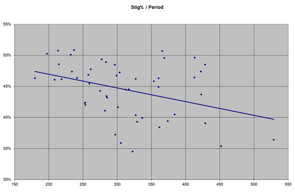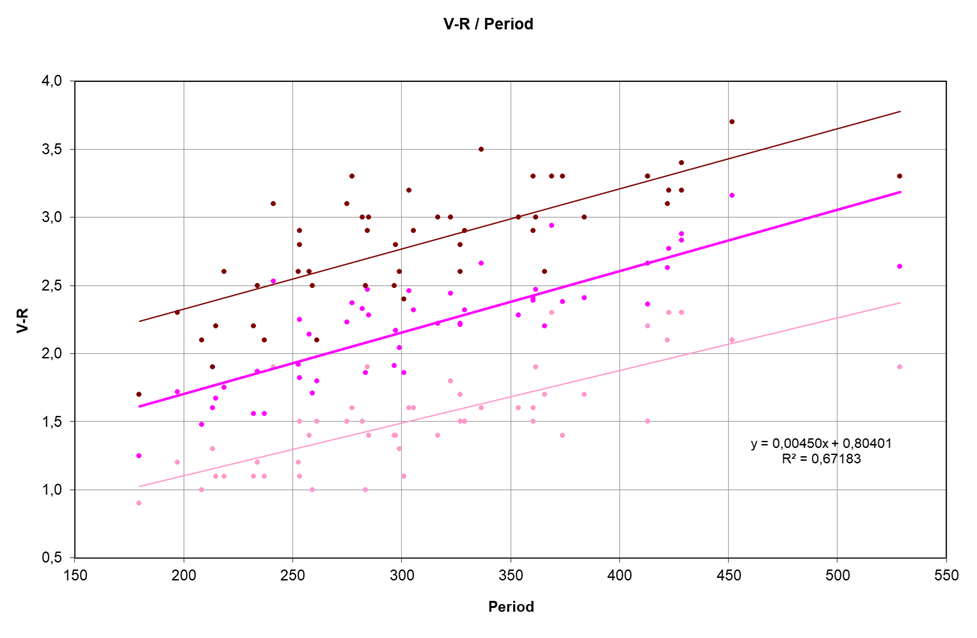 Två diagram från excelarket tycker jag är extra intressanta. Det är färgindexet V-R plottat mot perioden och ljuskurvans stigande fas andel av cykeln (stig %) plottat mot perioden. Färindexet är inte så konstigt, utan visar att miror med längre period är stjärnor som är större och svalare. Varför mirorna med lång period också har en tendens att snabbare gå från min till max än miror med kortare period har jag ingen riktigt bra förklaring till.