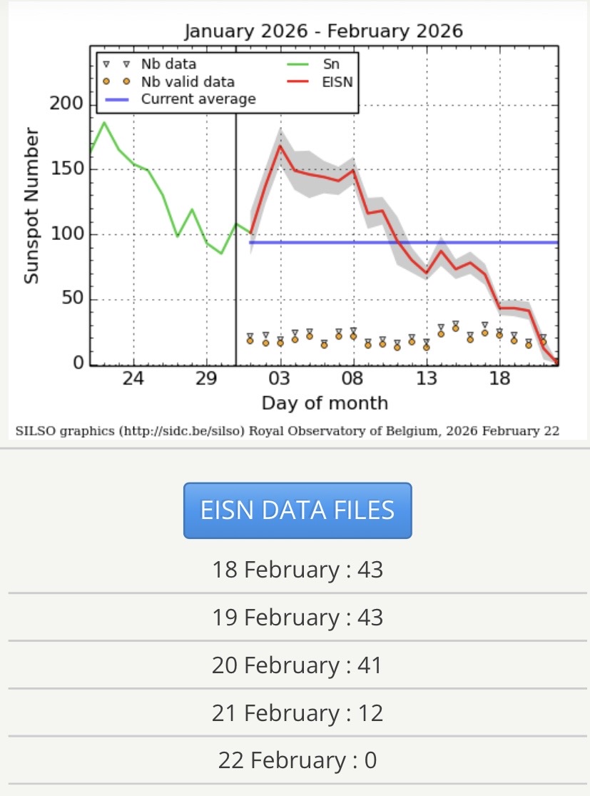 Sedan igår kväll (21 feb 2026) har solen varit fläckfri. Om ingen fläck dyker upp under dygnets lopp kommer det internationella solfläckstalet idag att bli noll. Senast detta hände var 9-11 december 2021.