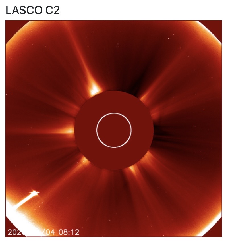 Solsnuddarkometen C/2026 A1 (MAPS) håller fortfarande ihop, vilket framgår av denna bild från LASCO C2 som togs på påskaftonen klockan 10:12 svensk sommartid.