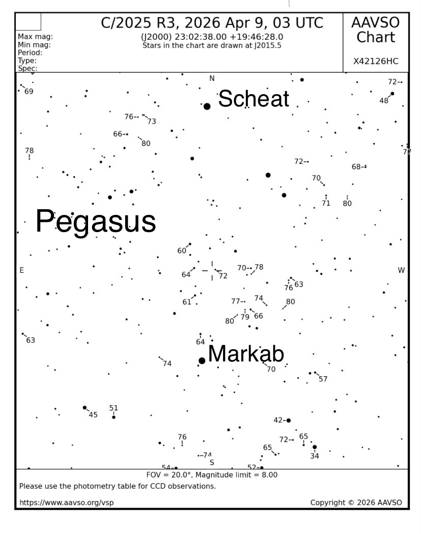 Kometen är nu på väg in i Kvadraten i Pegasus, den ligger nästan på linjen mellan Scheat och Markab, kvadratens två ”högra” stjärnor, betydligt närmare den sistnämnda.