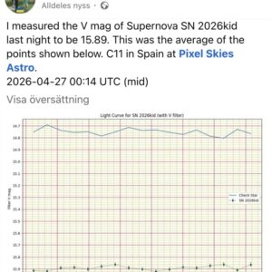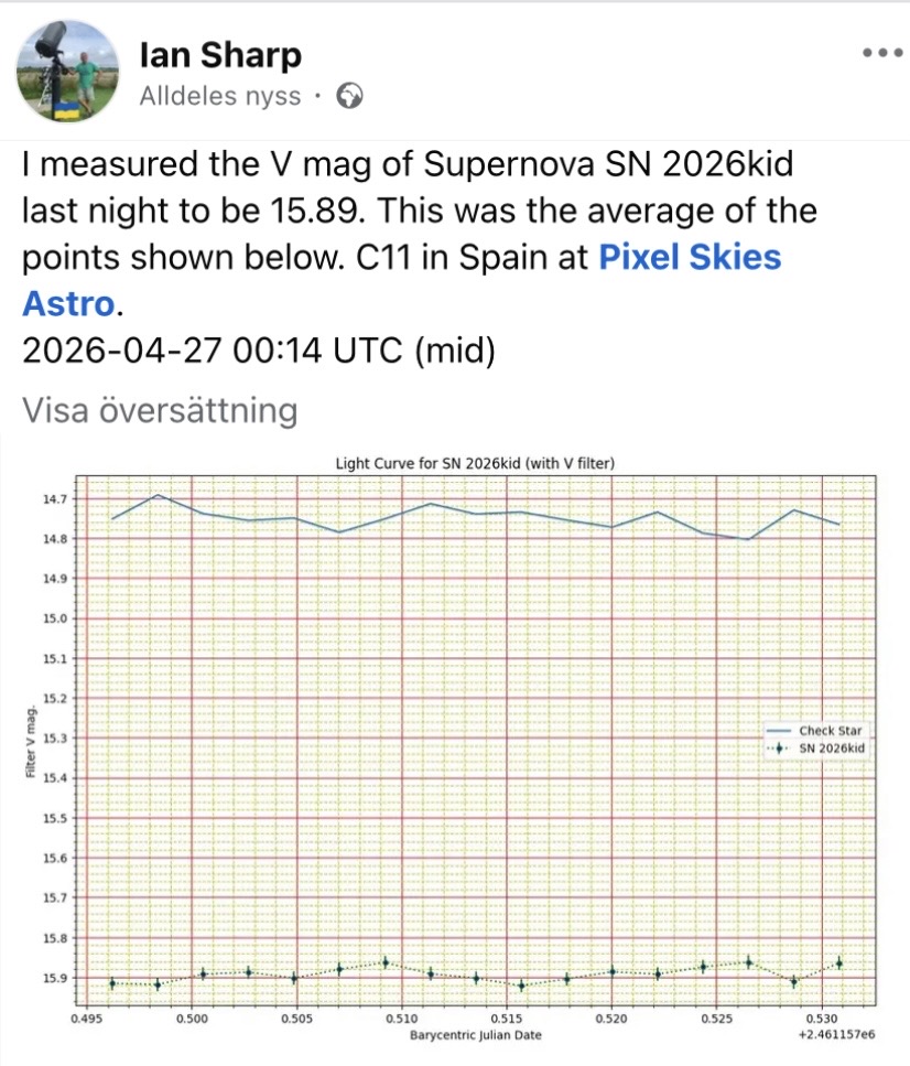 Supernovan SN2026kid är nu (27 april) av visuell magnitud 15.9, se bifogat klipp.