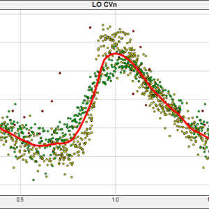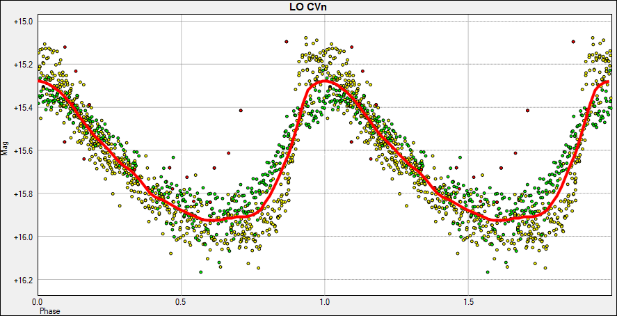 Om man kombinerar observationer från AAVSO och våra från SVO får jag följande fasdiagram. Gula punkter är AAVSO, gröna UAA, röda mina från COAST-bilder. Förutom mina obsar, som jag behöver kontrollera igen, stämmer serierna ganska bra överens.