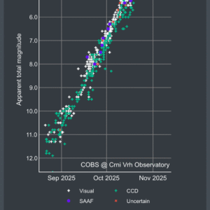 ”My affair with T Coronae was not a happy one. Normally T was a star that hovered around tenth magnitude until back in May 1866 when it suddenly increased until it was equally as bright as nearby Alphecca, the brightest star in the Northern Crown. In true nova form it soon began to fade and eventually was back as before though with the occasional flutter that seems inherent in the metabolism of some of these stars.