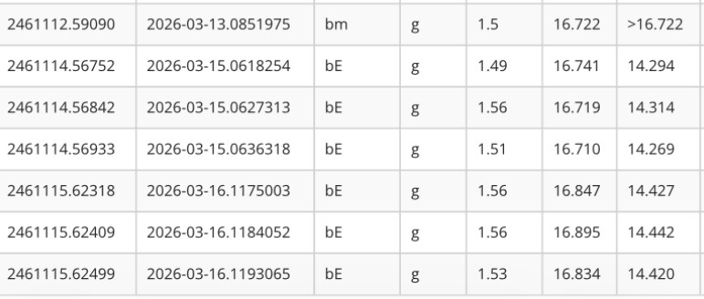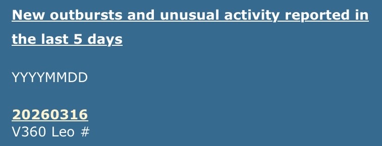 ASASSN har fångat det nu aktuella utbrottet. Stjärnan hade natten 14-15 mars 2026 g-magnitud ca 14.3, och natten 15-16 mars ca 14.4.