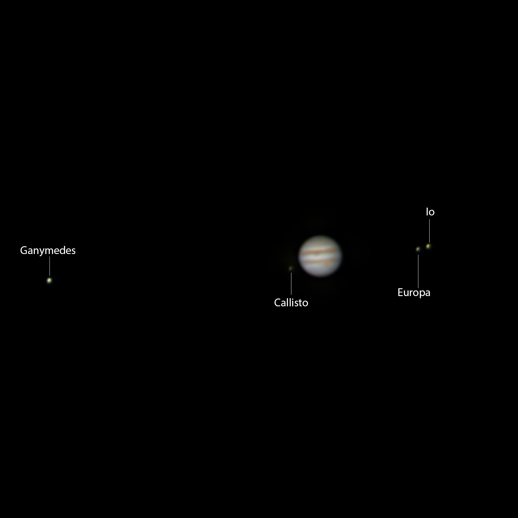 Separata tagningar direkt efter varandra för månarna och för planeten. Ingen Barlow. Efter stackning och bildbearbetning sammanfört dem i Photoshop. Hade sedan tänkt fota enbart planeten, med Barlow 5, men då kom moln.Objekt: Jupiter och de Galileiska månarna