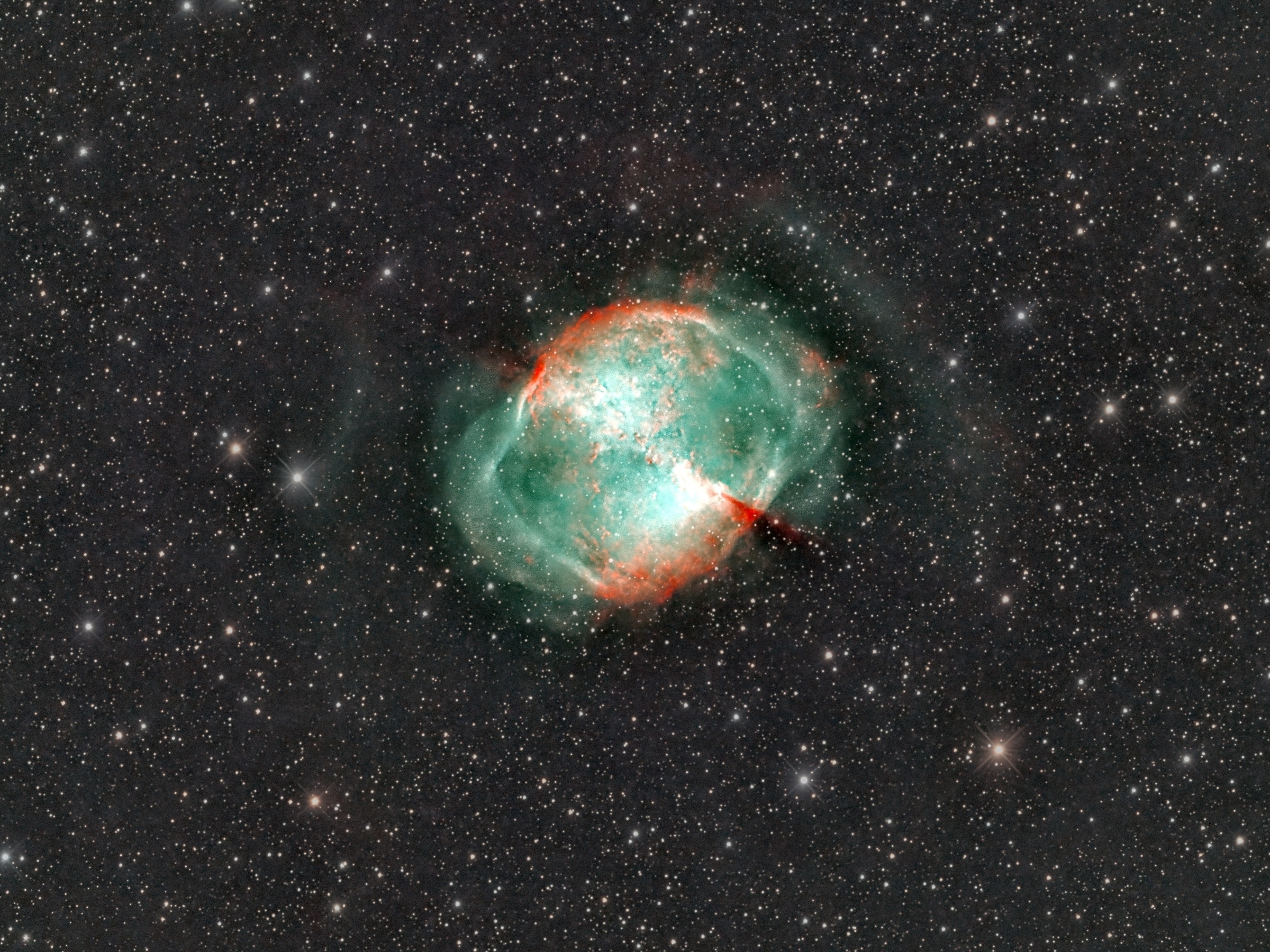 Det som annars är markant i nebulosan är de yttre områdena av den cirkulära delen, som ser ut som en “sammetsliknande filt”. Starkast i OIII. Den vanligen upplevda transparensen hos nebulosan försvinner då stjärnorna är eliminerade… Vidare ser man H-alfa och SII-strukturerna som ligger som pärlor från centrum och utåt.