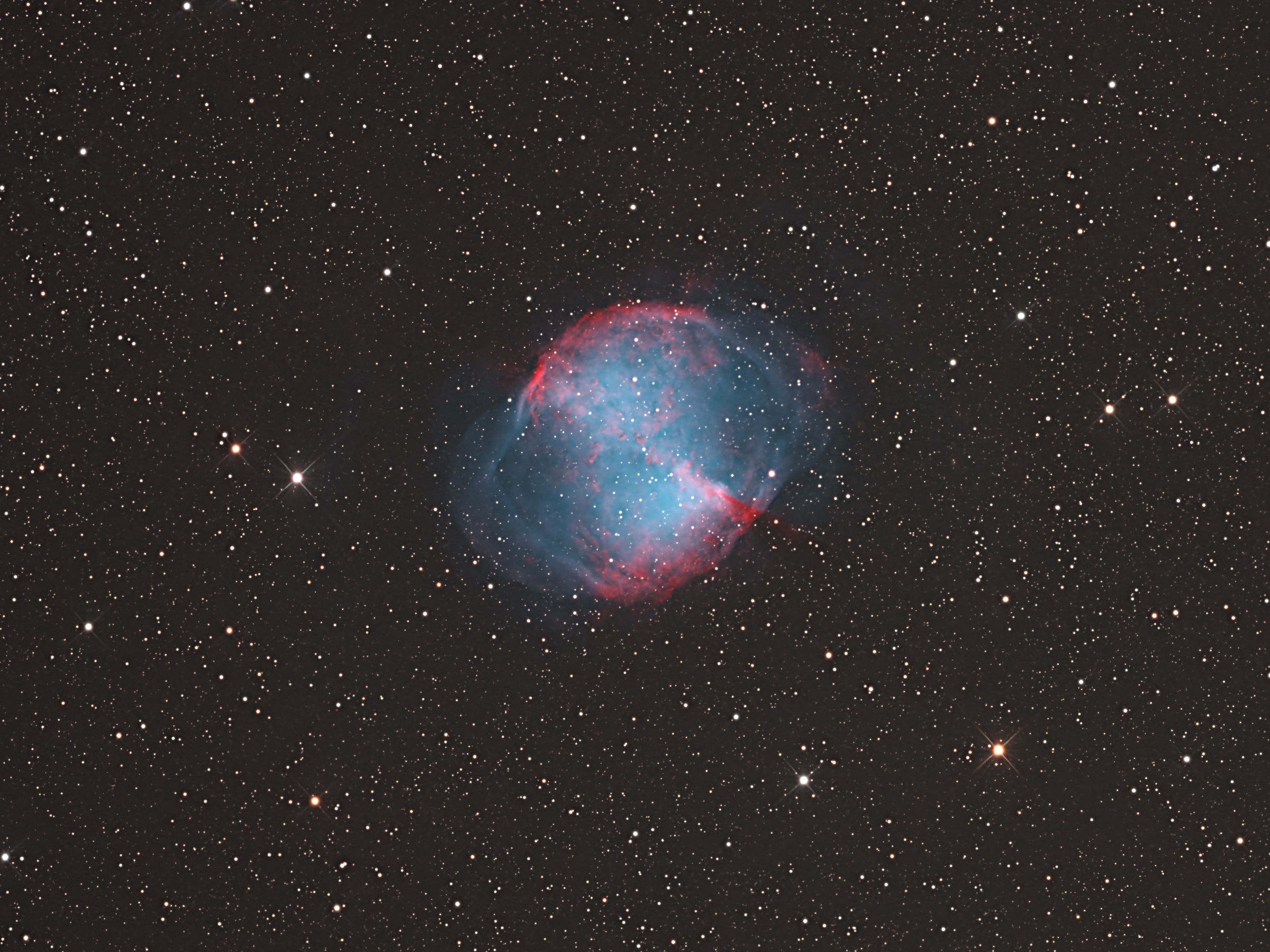Messier 27 är ju en tämligen ljusstark emissions-nebulosa. Det var många år sedan jag fotade den. Jag tyckte det kunde vara intressant att se vad man kunde uppfatta av de lite svagare delarna av nebulosan. Trots en något ljus sensommarhimmel och halvtaskigt väder så tog jag en första serie bilder i LRGBSHO i slutet av augusti.