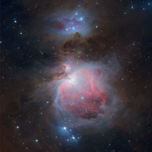 Området kring Orionnebulosan fotat under två kvällar med god transparens men ljus himmel på grund av snötäcke (Bortle 4). Korta 15-sekundersexponeringar användes för att inte saturera Trapetset för hårt. Totalt 58 min exponeringstid.Objekt: M42 Orionnebulosan