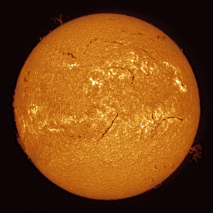 Jag dammade av min spektroheliograf (SHG) och tog några bilder nu när solen börjar stiga över 20°. Det blev 10 skanningar mellan kl 10.45 – 10.54 med solhöjd cirka 21° strax över grannens tak. De 10 bilderna stackade till en bild. Skanninghastighet 13 x siderisk.Objekt: Solen