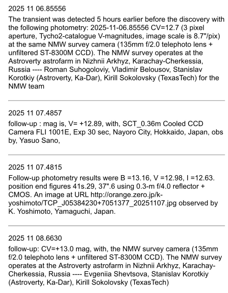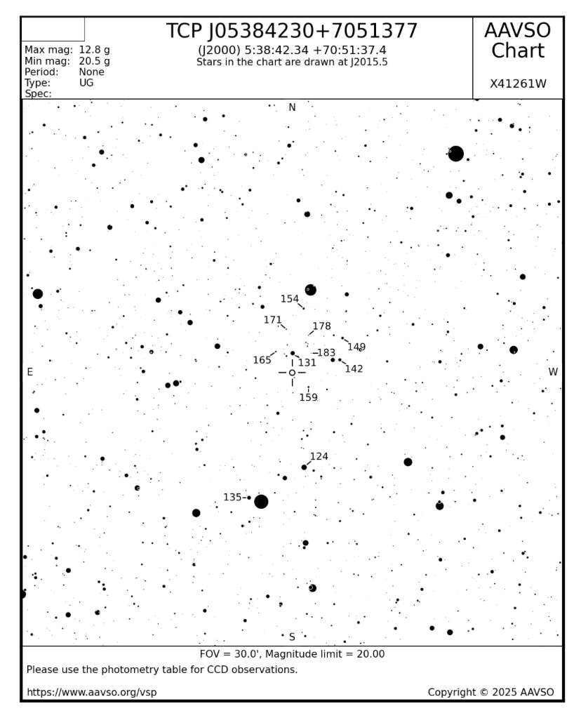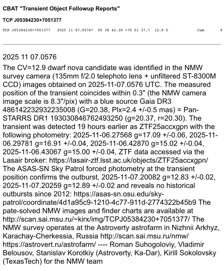 En dvärgnova av typ UGWZ har upptäckts i Camelopardalis. Magnitud ca 12.8.