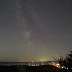 Jag tog den här bilden den 23 september. Man ser här Vintergatan och Sagittarius gå ner i Skagerrak i sydväst. Bilden är tagen vid Hälleviksstrand på västra Orust och visar Kråksundsgap söder om Käringön. Ljusen vid horisonten är förmodligen samhällen på Jylland. Möjligen Skagen. Man ser delar av Sagittarius “tekanna” stå nedstucken under horisonten. Stjärnorna Nunki och Kaus Borealis är ljusa och tydliga på bilden.