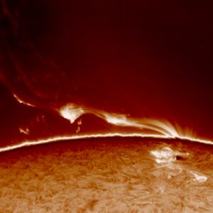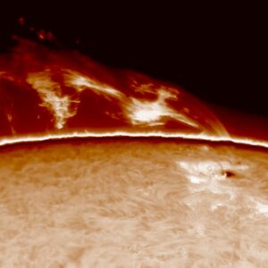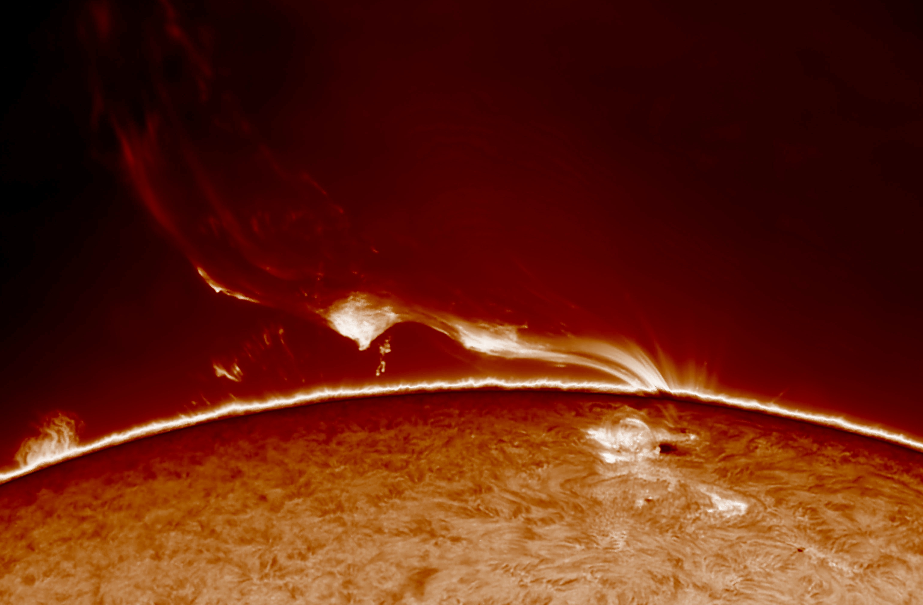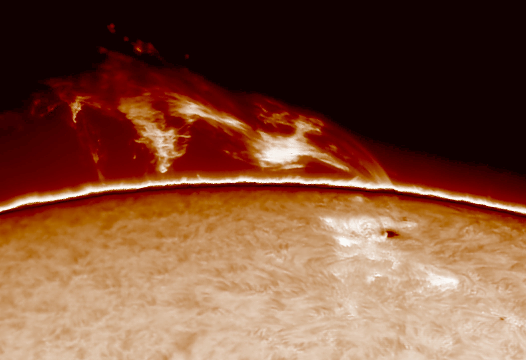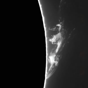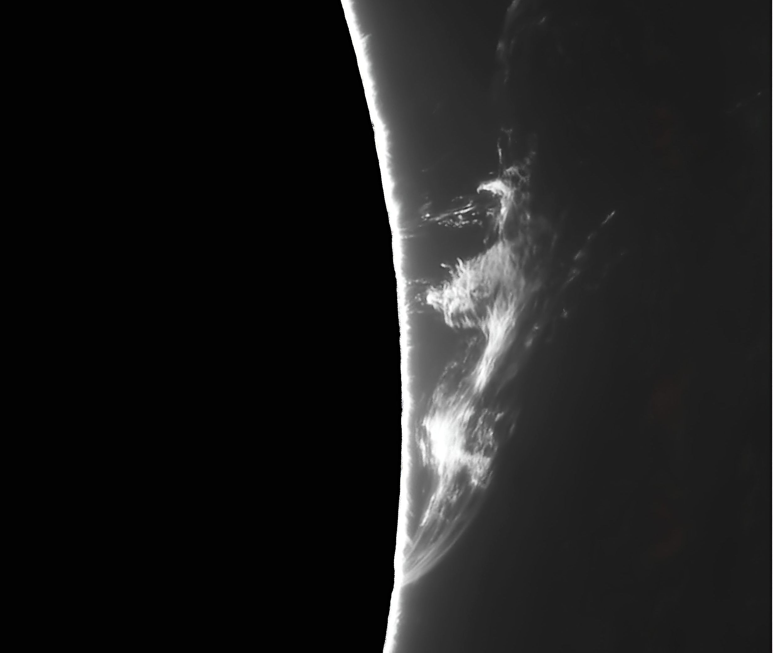 Flera kraftiga eruptioner inträffade 24 april på solen. Jag satt i godan ro poå min terrass och läste Ciel & Espace när jag blev varse att en X-2.5 Flare uppstod i AR 4419 vid solranden. Det var bara att kasta sig över närmaste solteleskop. Utbrottet skedde ca 08.13 UTC, och jag tog några bilder från 08.46 UTC och framåt. Det var kanske det häftigaste utbrottet jag sett på länge! Helt otroligt!Objekt: Solar Flare