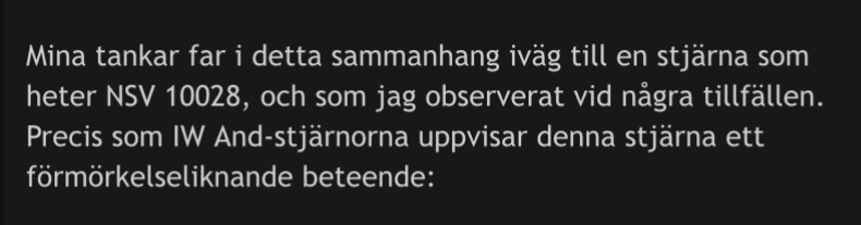 Däremot blev jag förvånad över att jag obsade RY Oph ett par gånger 2010, det hade jag totalt glömt bort. Mysko, den ligger för nära ekvatorn för att jag skulle ha den på programmet. Men lite detektivarbete gav svaret. Jag tog RY Oph som bonus när jag ändå obsade V3288 Oph. Varför jag obsade V3288 Oph kändes också som en gåta, tills jag såg att det är den stjärna som 2010 ännu hette NSV10028. Och det namnet kände jag igen. En sorts säregen förmörkelsevariabel som det skrevs en del om, och som jag nämnde på Astronet (se klipp).