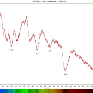 De kraftiga linjerna från joniserat kisel (Si II) visar att det är en supernova typ 1A. Att den starkaste är blåförskjuten från normala 6355 Ångström visar med vilken radialhastighet massautkastningarna rör sig mot oss. Blåförskjutningarna från utkast avtar med tiden.
