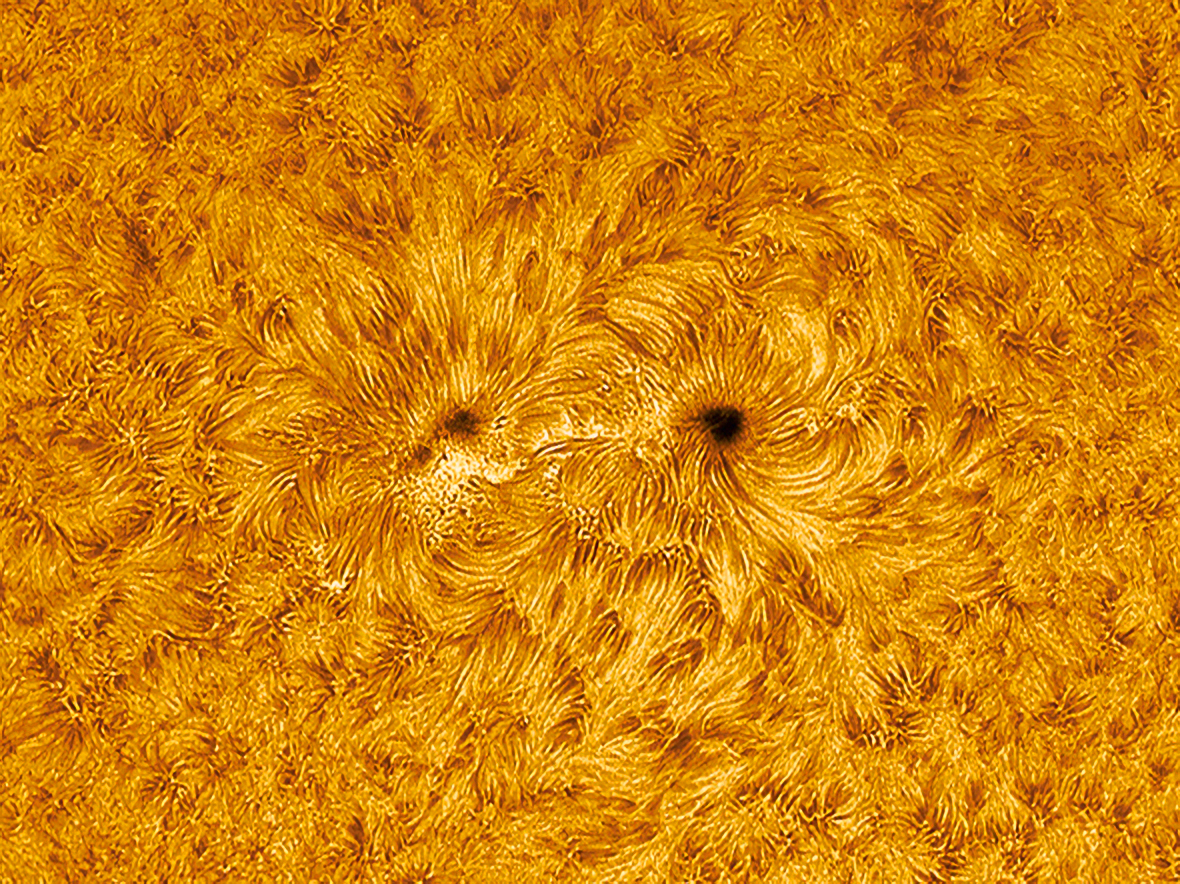 Idag 2026-04-19 var förhållandena mycket svåra på grund av blåst, turbulens, svårt att tuna in teleskopet på rätt våglängd så jag förväntade mig inte något spännande resultat men när jag hade stackat och skärpt upp en sekvens på 500 bilder så framträde en massa ljusa prickar runt solfläcksgruppen AR 4419 som måste vara så kallade Ellermans bombs. Jag har medvetet hållit bilden lite mörk för att de ska synas tydligare.