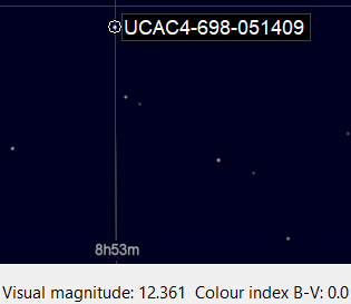 Det jag reagerade på är att stjärnan visas som magnitud 12.361 i Cartes du Ciel. Galaxen är det vänstra objektet i “stjärnparet” under UCAC-stjärnan.